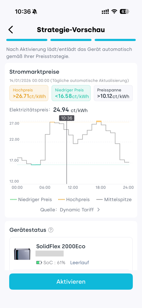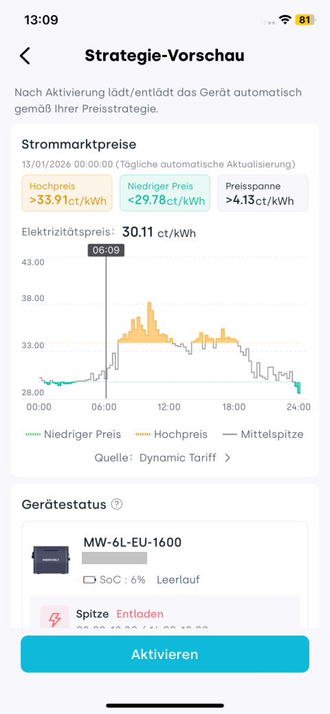 5. Prüfen Sie den vom System erzeugten Lade-/Entladeplan. Tippen Sie auf Aktivieren, um die Strategie zu aktivieren.