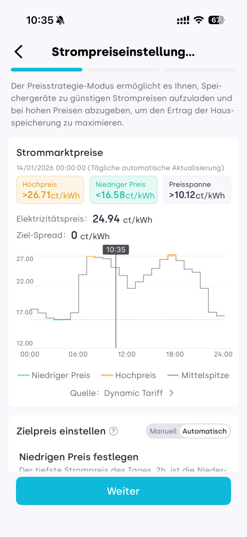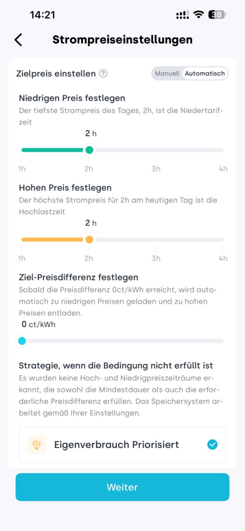 3. Legen Sie den Zielpreis einstellen (manuell/automatisch) fest, der das Lade- und Entladeverhalten auslöst, sowie die Strategie, wenn die Bedingung nicht erfüllt ist (Eigenverbrauch Priorisiert / Leerlauf). Tippen Sie auf Weiter.