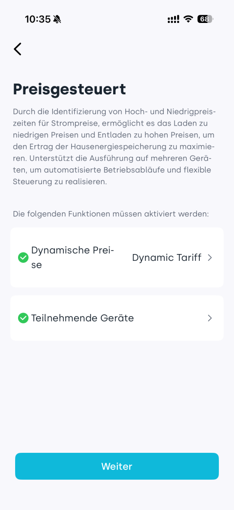 2. Folgen Sie den Hinweisen und stellen Sie sicher, dass Sie bereits einen Stromtarif konfiguriert und geeignete Geräte für die Strategie im Haushalt hinzugefügt haben. Falls nicht, tippen Sie auf die entsprechenden Bereiche und schließen Sie die Einrichtung ab. Tippen Sie danach auf Weiter, um fortzufahren.