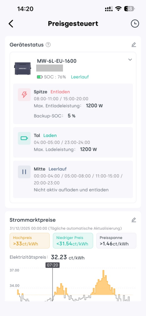 Die preisstrategie ist das Kernstück des Smart-Modus. Durch Festlegen von Preisschwellen lädt das System intelligent bei niedrigen Preisen und entlädt bei hohen Preisen – so werden die Vorteile von Strompreisschwankungen maximal genutzt.