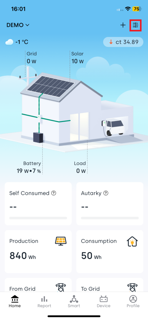 The Home page serves as the main interface for managing energy data in your current home. It provides an overview of real-time generation, consumption, and overall energy flow.