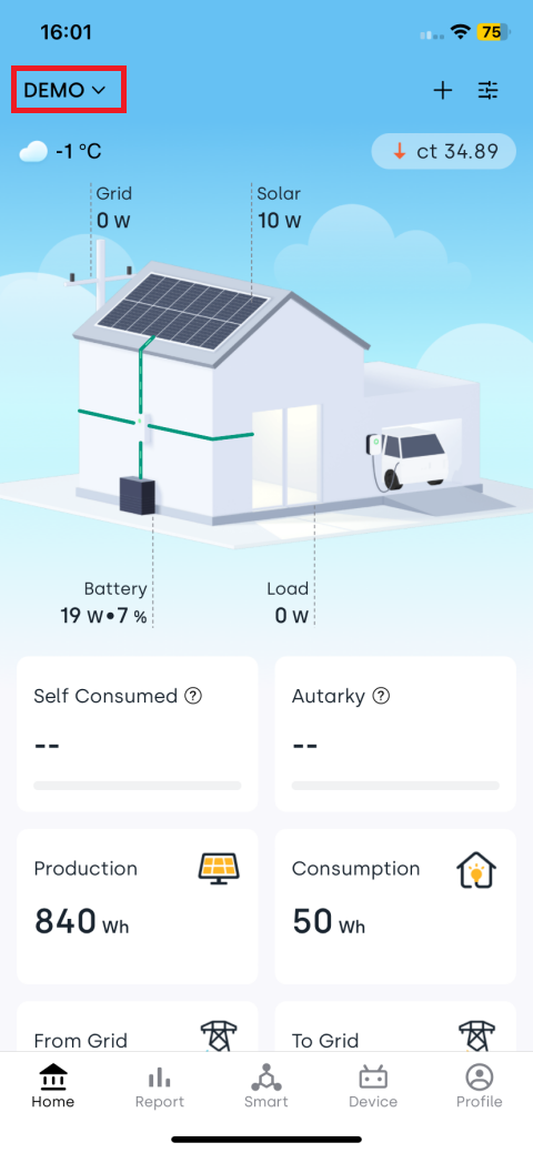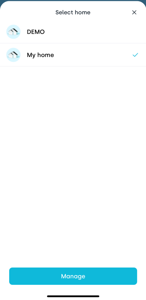 Tap the home name at the top left to open the list of all homes linked to your account. Choose a home to switch to its energy-data view.