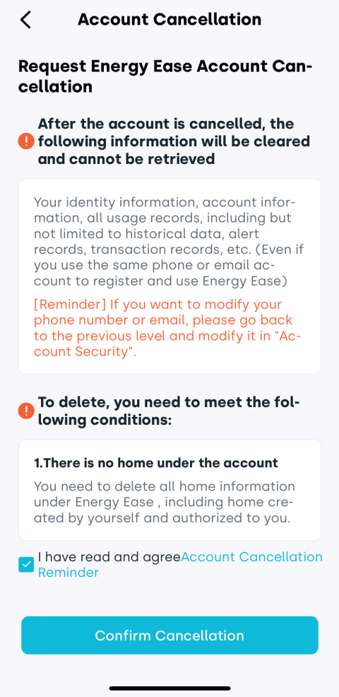 Carefully review the on-screen instructions and the “Account Cancellation Reminder”. Confirm that you meet the conditions and understand the consequences. If no concerns, check I have read and agree Account Cancellation Reminder.