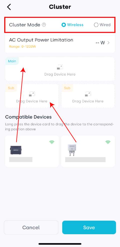 Select Cluster Mode: wireless or wired. Press and hold device cards and drag them into the main or sub slots.