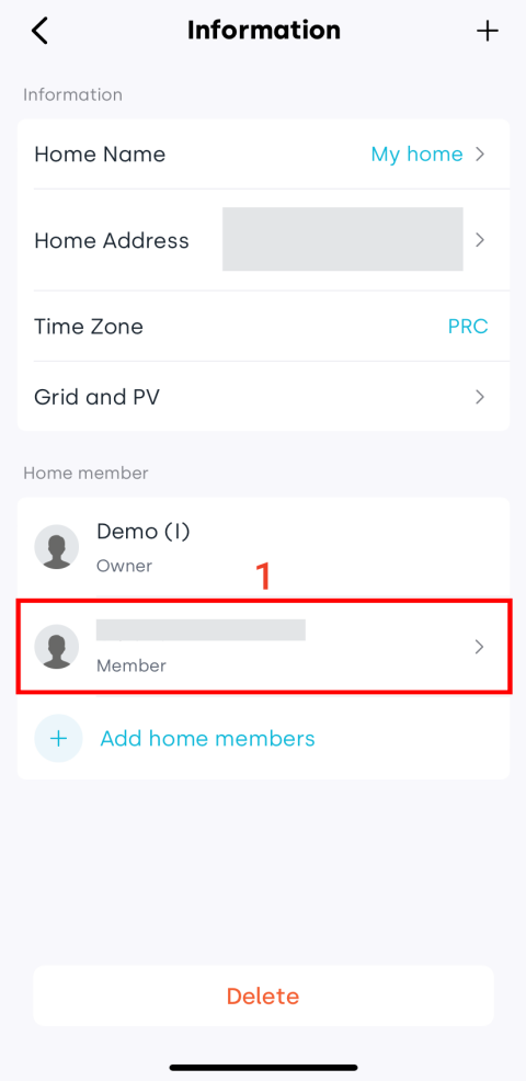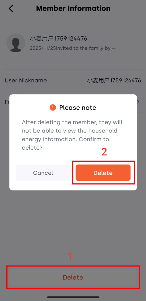 At the bottom of the member information page, tap Delete. The app will ask for confirmation; after confirming, the member will be removed.