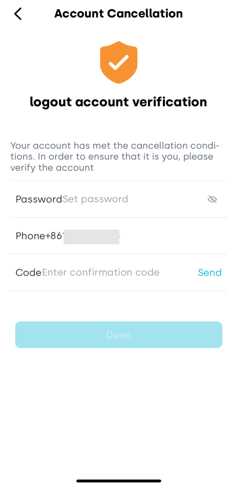 Enter the confirmation code received, then tap Done to complete the account deletion.