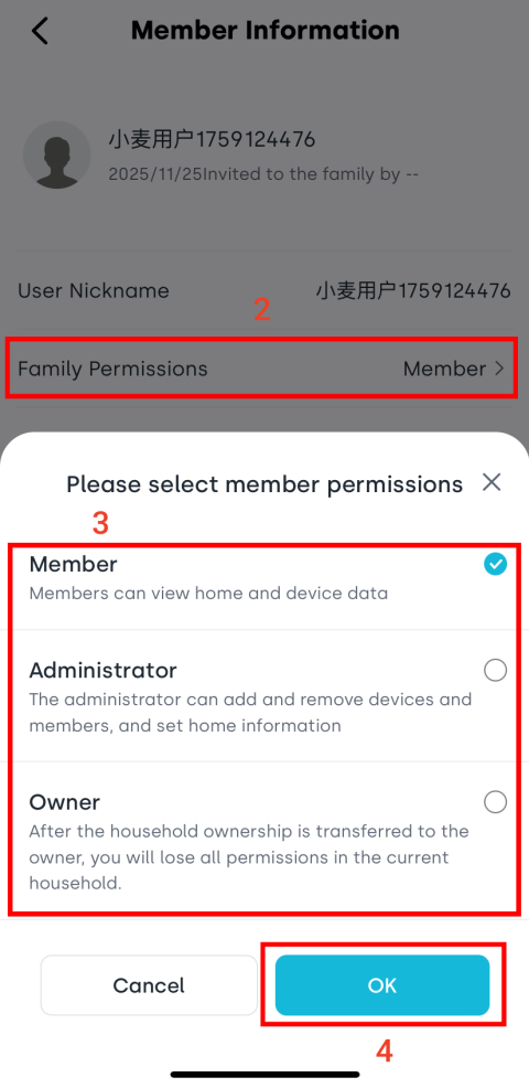 Permission Description Member View home and device data only. Administrator Can add and remove devices and members, set home information. Owner Transfers home ownership; you will lose all permissions for this home. -