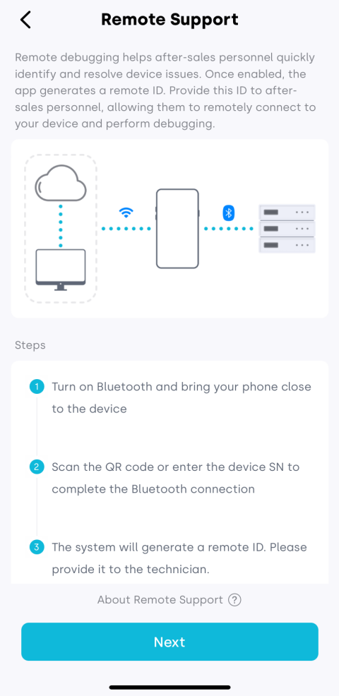 Scan the device QR code or manually enter the SN to establish a Bluetooth connection.