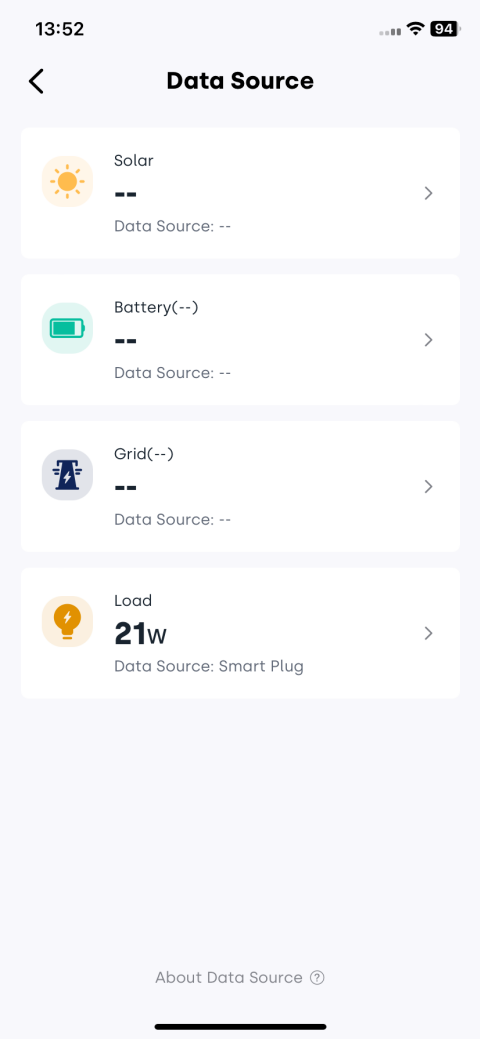 With Data Source settings, you can specify the data sources used for home energy statistics to improve the accuracy and reliability of analytical results. The system supports four types of data sources: Solar, Battery, Grid, and Load.