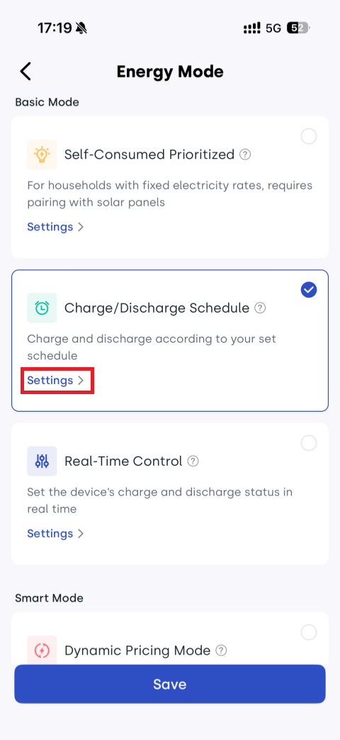 - Select Charge/Discharge Schedule and tap Settings.