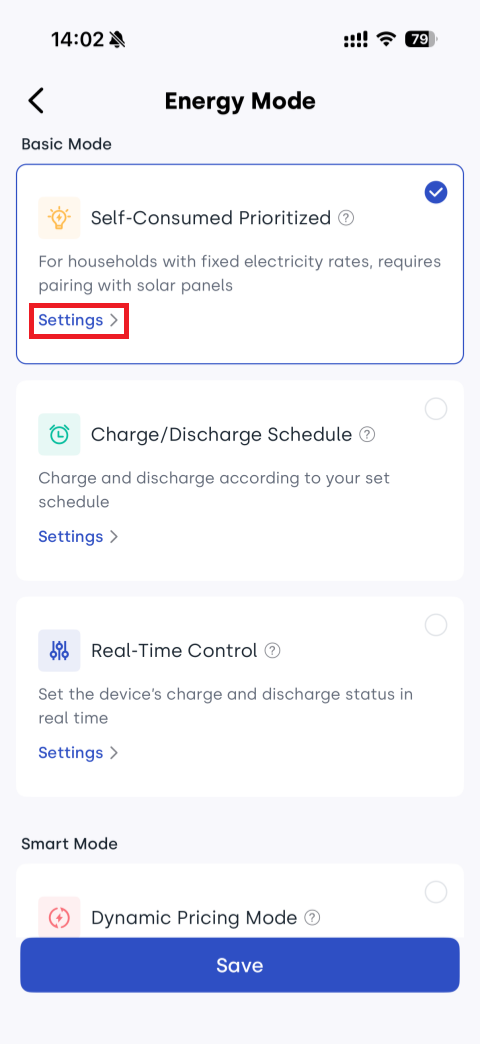- Select Self-Consumed Prioritized and tap Settings