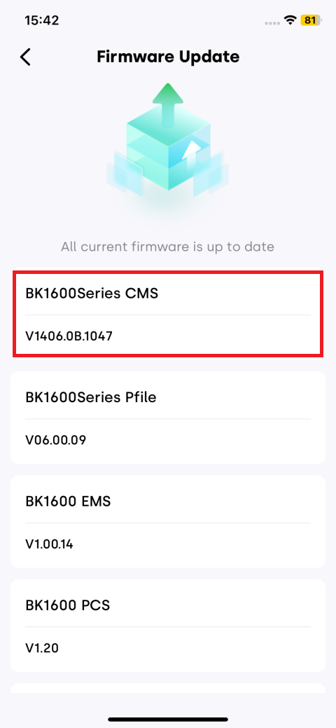 Model Applicable firmware version BK1600/BK1600Ultra V1.3.0A_R006.072_M4848_00000039 SolidFlex2000/PowerFlex2000 CMS:CMS:V1406.07.002E You can check the device firmware version in the INDEVOLT app. Go to the device settings page and open Firmware Update to view the current version.
