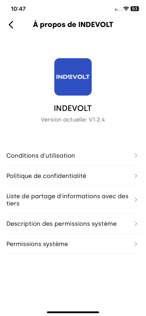 Touchez À propos de INDEVOLT pour en savoir plus sur l’application : version actuelle, accords de service et confidentialité, liste de partage d’informations à des tiers, description des autorisations et gestion des permissions système.