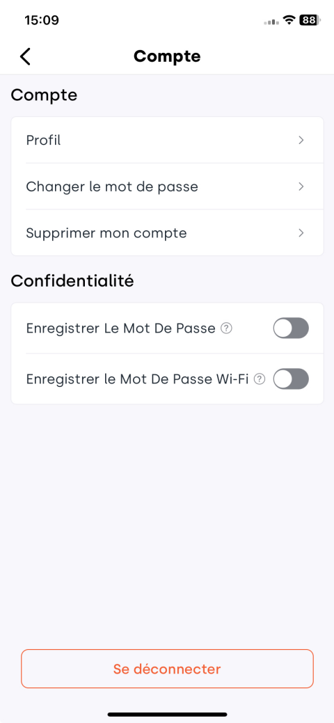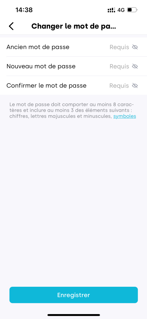 Touchez Changer le mot de passe, puis suivez les instructions pour saisir votre mot de passe actuel et le nouveau. Après enregistrement réussi, le système redirigera automatiquement vers la page de connexion pour vous reconnecter avec le nouveau mot de passe.