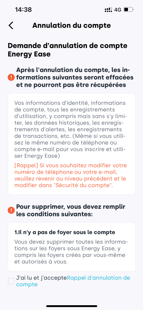 - Lisez attentivement les instructions et le Rappel d'annulation de compte. Vérifiez que vous remplissez les conditions et comprenez les conséquences. Si tout est correct, cochez J’ai lu et j’accepte le Rappel d'annulation de compte.