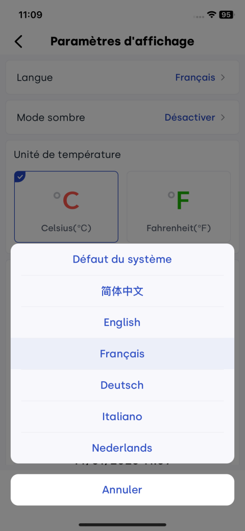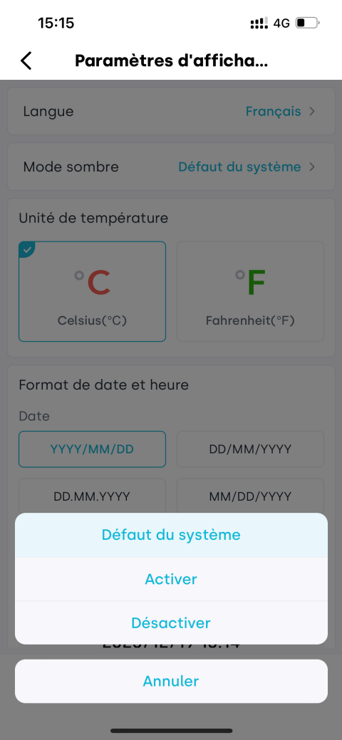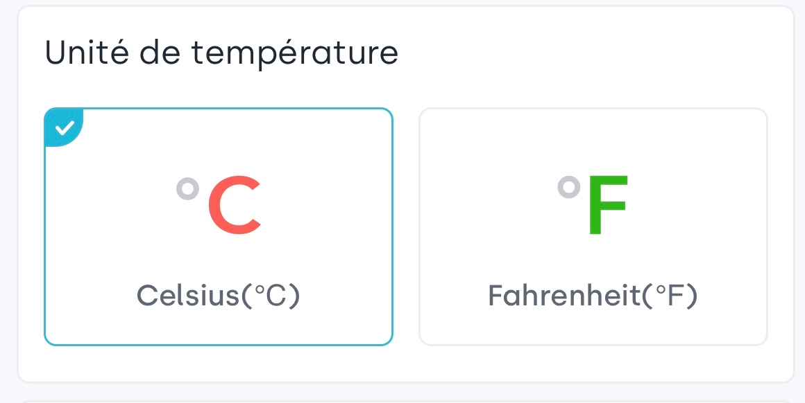 Choisissez votre unité préférée : Celsius (℃) ou Fahrenheit (℉).
