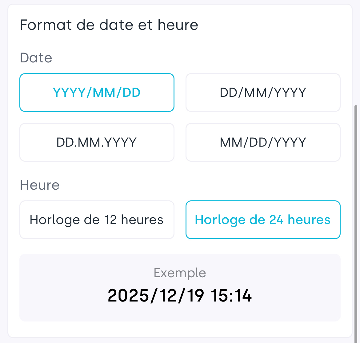 Personnalisez l’affichage de l’ordre de la date et du format 12/24 heures.