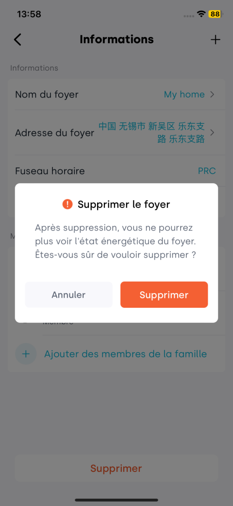 En bas de la page de gestion, touchez Supprimer. Après confirmation, la maison sera supprimée.