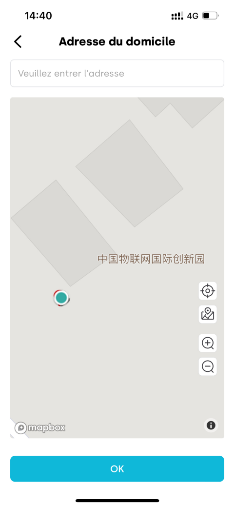 - Adresse du domicile : l’application renseigne automatiquement une zone approximative ; vous pouvez toucher l’icône à côté du champ pour repositionner sur la carte Mapbox.