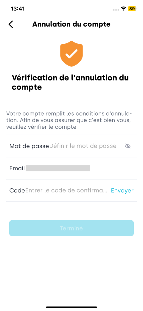 - Saisissez le code de confirmation reçu, puis touchez Terminé pour finaliser la suppression du compte.