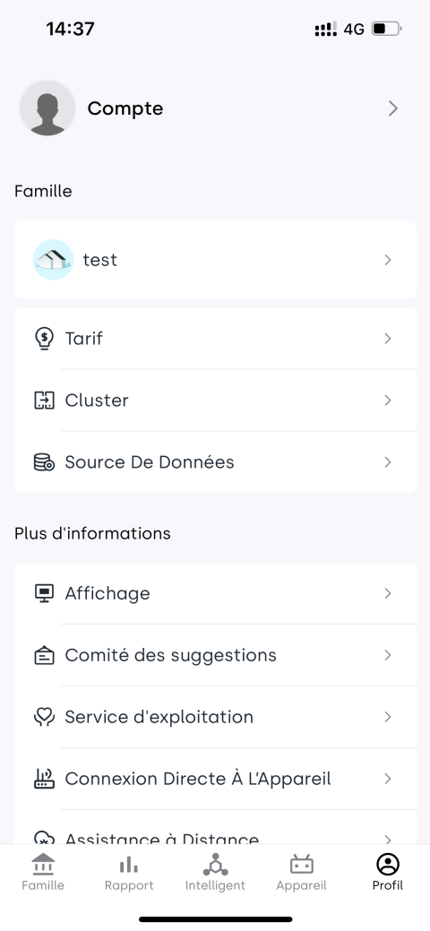Cliquez sur l’onglet Profil dans la barre de navigation inférieure pour accéder à cette page. Elle permet de gérer les informations du compte, d’ajuster les paramètres de l’application et de configurer les options de personnalisation.