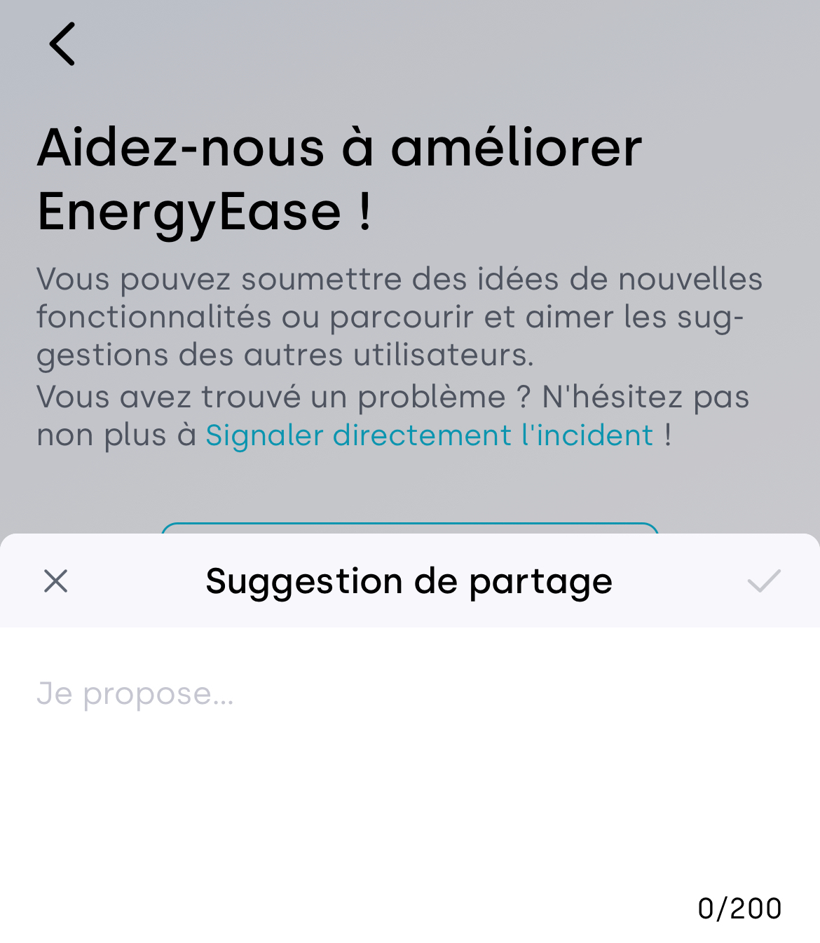 Partager une suggestion : Touchez Suggestion de partage pour proposer des améliorations ou nouvelles fonctionnalités.