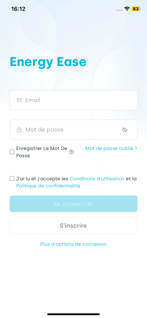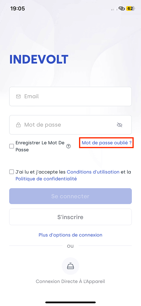 Après avoir installé l'application INDEVOLT, ouvrez-la pour accéder à la page de connexion.