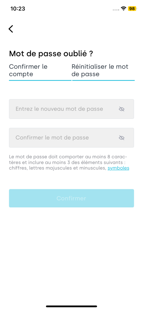Sur la page de réinitialisation du mot de passe, entrez votre nouveau mot de passe et confirmez-le, puis appuyez sur Confirmer.