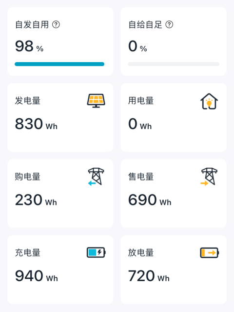 | 自发自用 | (光伏供电的用电量 + 光伏对电池的充电量) / 发电量,衡量光伏发电被家庭自身利用的比例。 |