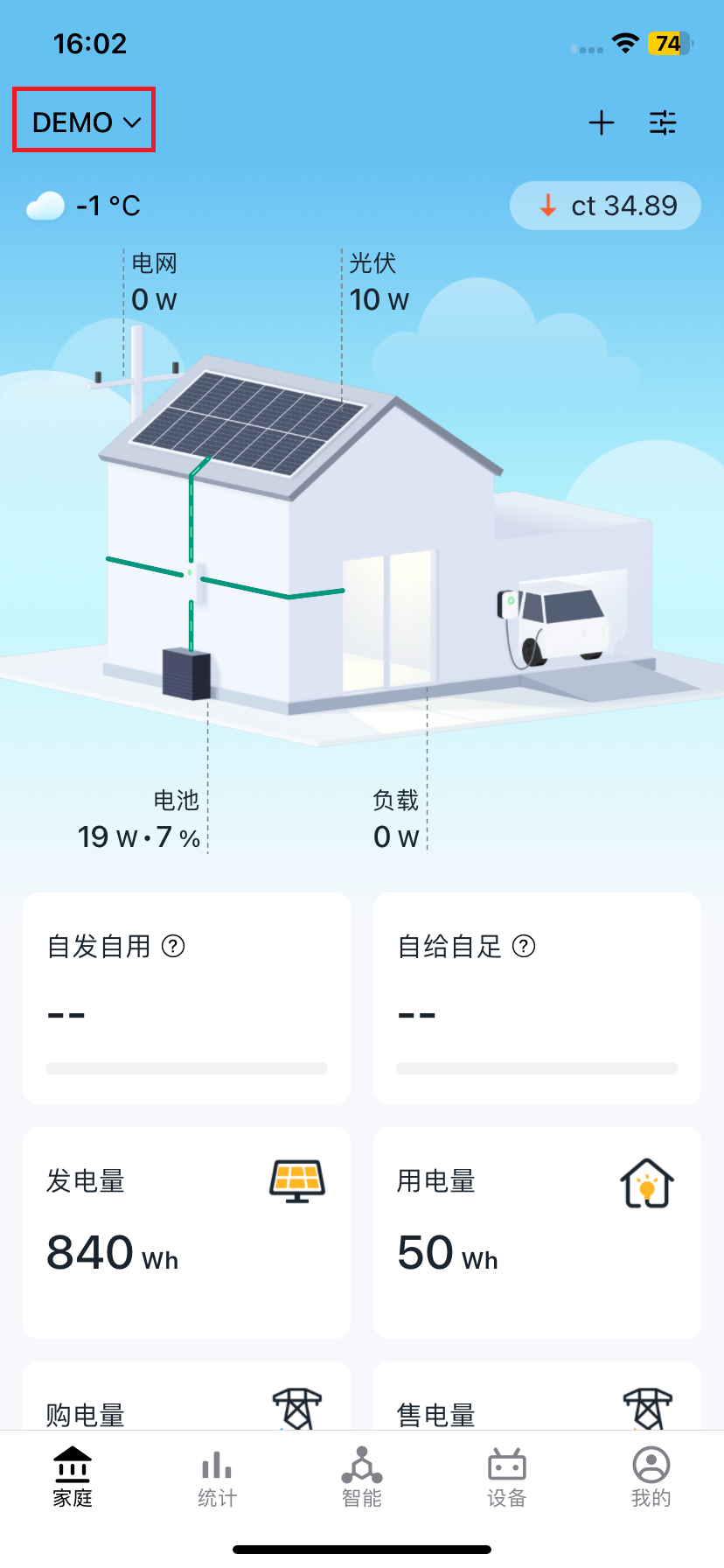点击界面左上角的家庭名称,即可展开账号下所有的家庭列表。选择目标家庭,即可快速切换至该家庭的能源数据视图。