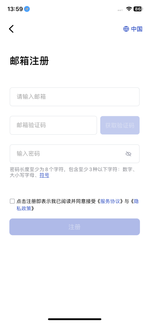 - 阅读并勾选同意《服务协议》与《隐私政策》。