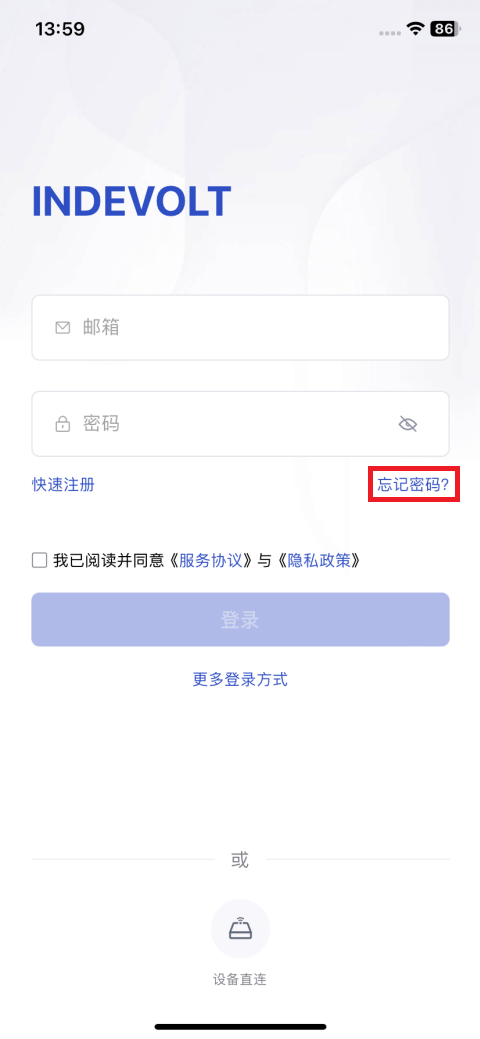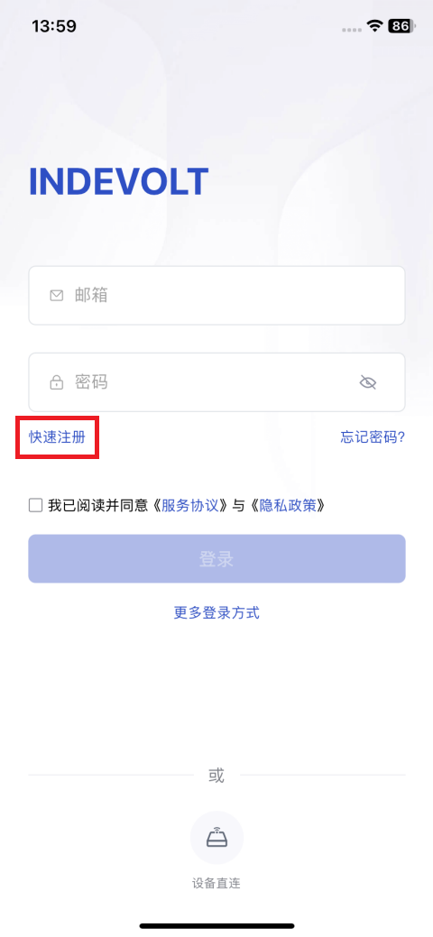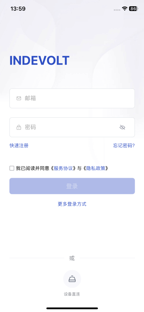 INDEVOLT App安装完成后,打开App进入登录页。
