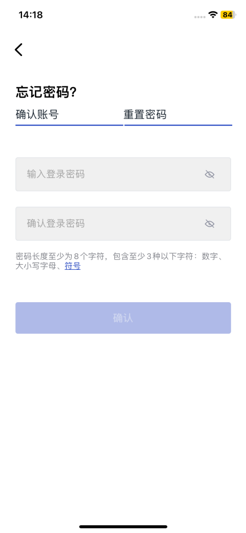 在重置密码页输入新的密码和确认密码,点击确认按钮;