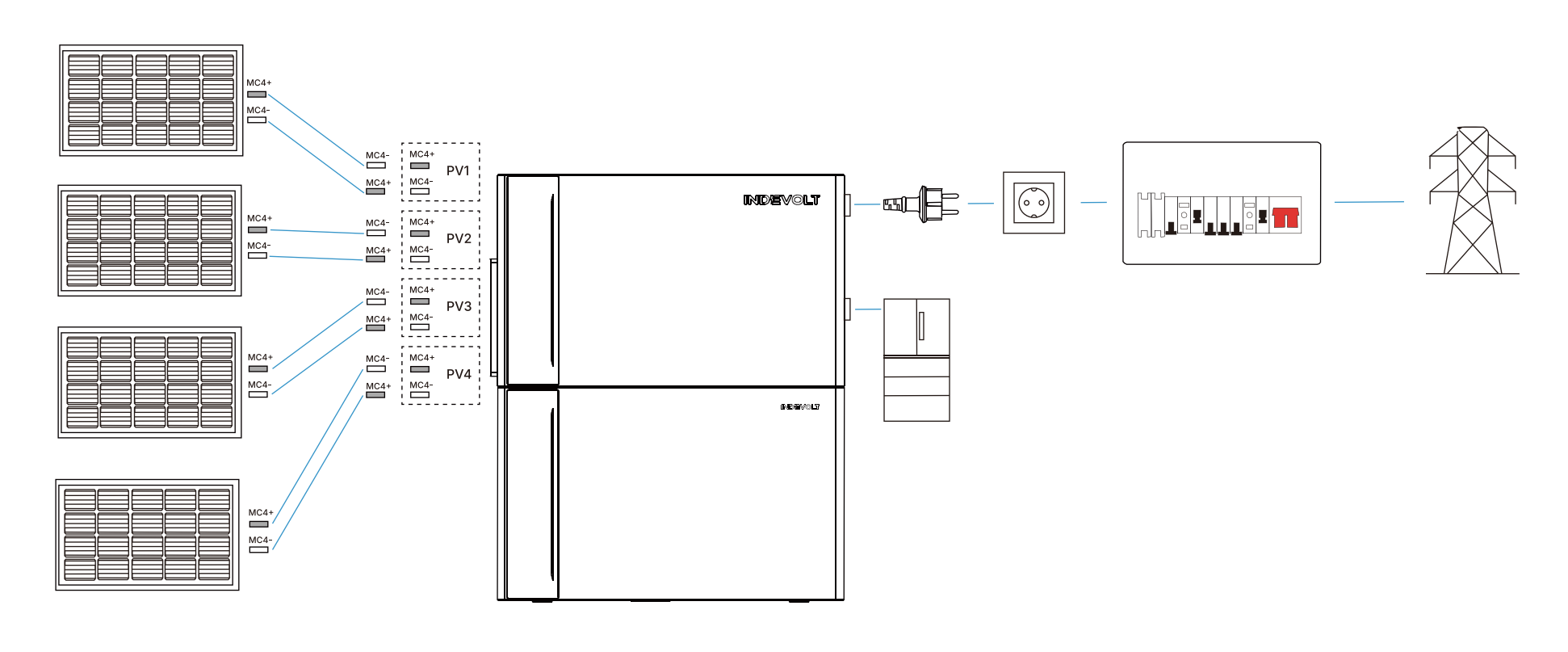 使用光伏延长线,将每组太阳能板的正负极输出端分别接入主机对应的 PV输入接口(标有PV1, PV2等)。